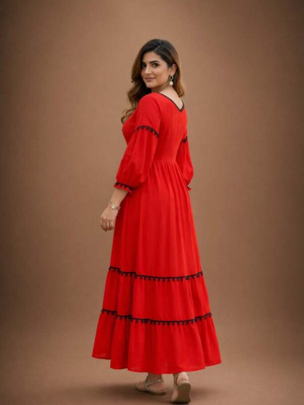 Women’s Red Tiered Maxi Dress with Black Pom-Pom Trim, V-Neck Long Puff Sleeve Cotton Blend Ethnic Gown, Lightweight